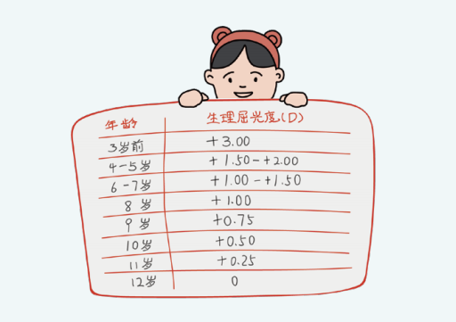 每個年齡孩子的遠視儲備量可以參考下表:如4~5歲的兒童生理屈光度為 150~200度遠視,則有150~200度的遠視儲備,如果此年齡段兒童的生理屈光度只有50度遠視,意味著其遠視儲備消耗過多,有可能較早出現(xiàn)近視。